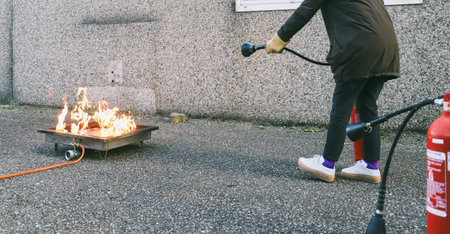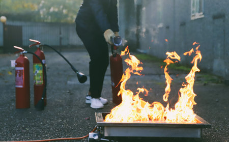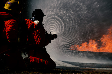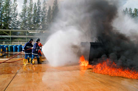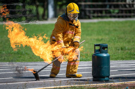 corporate safety - exercise during a firefighting course - Firefighter in action. Fire fighting training. Firefighter training.