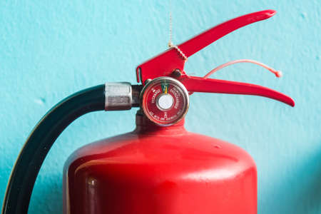 Fire extinguisher pressure gauge. Close up studio shot, isolated on blue background, no people.