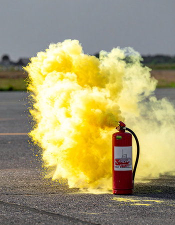 A brilliant yellow cloud erupts from a red fire extinguisher, creating a powerful and dynamic visual contrast against the gray asphalt.