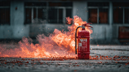 A red fire extinguisher sits amidst an eruption of flames in an outdoor environment. The image displays fiery orange hues with smoke, contrasted against a blurred building. This visual representation conveys a sense of emergency and safety, suitable for various commercial applications.