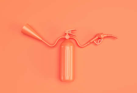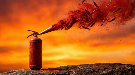 Red Fire Extinguisher Sprays Red Powder and Dried Chili Peppers Against an Orange Sky at Sunset