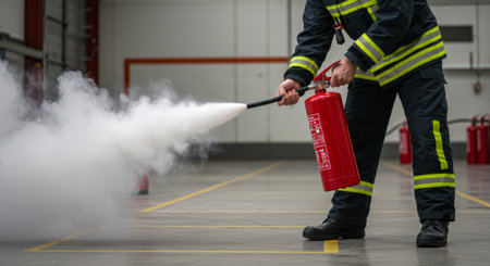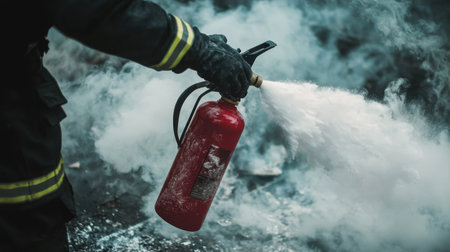 A firefighter using a red fire extinguisher to release foam in a dense smoke-filled background.
