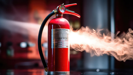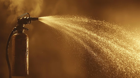 Close-up of a fire extinguisher spraying foam, creating a dramatic contrast in a hazy room.
