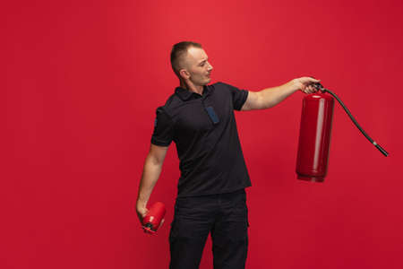 Fire safety. Portrait of young smiling man with extinguishers posing over red background.