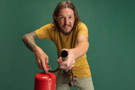 Comic portrait of young man with fire extinguisher having fun isolated on green studio background. Concept of occupation, job, funny meme emotions