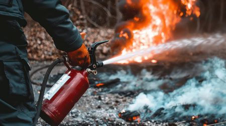 Firefighter using fire extinguisher to put out flames in forest fire, demonstrating fire safety and emergency response during dangerous wildfire situation