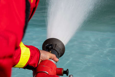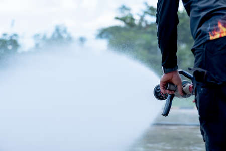 Firemen using water from hose for fire fighting at firefight training of insurance group. Firefighter wearing a fire suit for safety under the danger case.