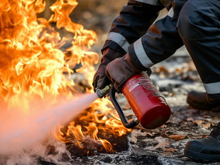 Firefighter extinguishing a fire with a fire extinguisher on a street