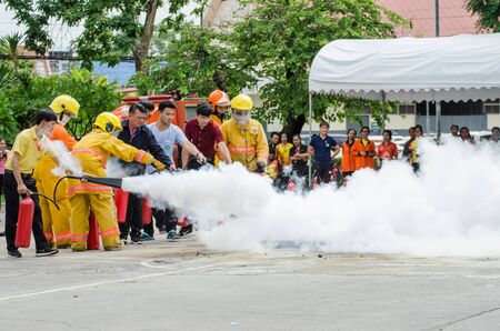Bangkok, Thailand - July 19, 2006: Fireman demonstrating how to putting out a fire and use a fire extinguisher