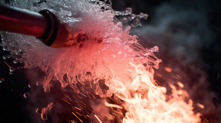 A fire extinguisher spraying foam against intense flames on a deep red backdrop.
