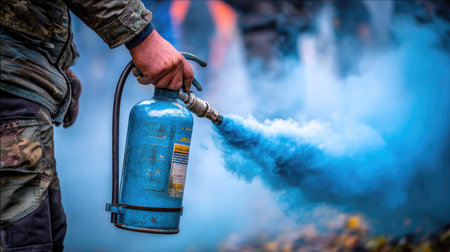 An individual activates a blue smoke device outdoors, producing a vibrant cloud of color. The image showcases the device's mechanics and the vivid smoke against a blurred backdrop. The composition features strong lighting and detail, potentially suitable for editorial content or creative projects.