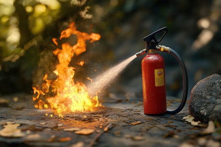 A close-up shot features a bright red fire extinguisher, standing in sharp focus. Behind it, a blurred scene depicts a large fire with billowing smoke. The composition showcases warm colors of the flames contrasted with the cool tones of the surroundings, suggesting an outdoor environment with potential editorial usage.