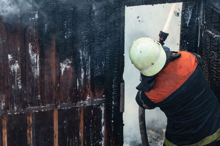 Extinguishing a major fire. A professional fireman in a special suit extinguishes an open fire with a fire extinguisher.