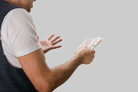 A man businessman in a suit refuses of money that is held in the hands of a person offering a bribe. Concept of bribery and corruption