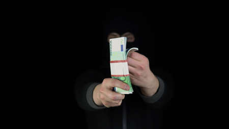 A man in a balaclava mask holds out a wad of euro. Bandit leafing through money. On a black background.
