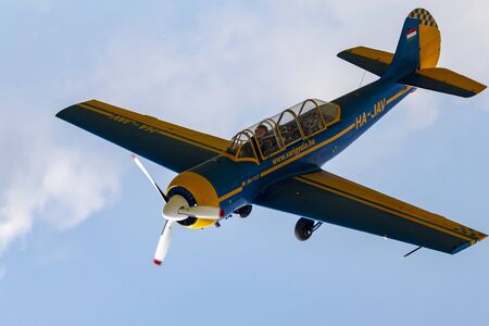 Dunakeszi Hungary - Jun 8 2019: Yak-52 aircraft. Hungarian flying team performing with Mr. Gy. Vari on the lead.