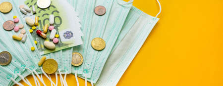 Sale of medical masks. Protective medical mask and different types of pills next to money on yellow background.The concept of inflation in medicine.