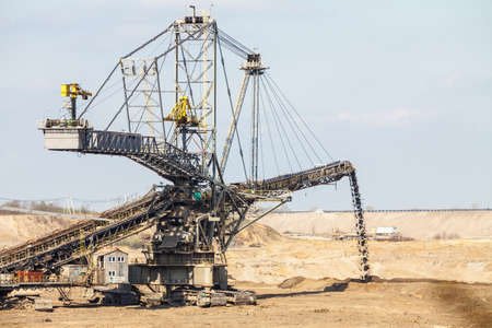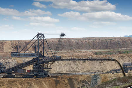 Open pit. Opencast brown coal mine. Giant excavator machinery. Extractive industry.