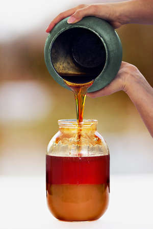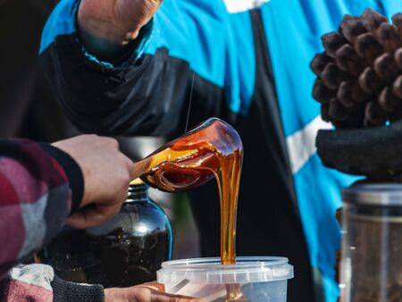 the seller puts honey in a jar to the buyer with a large wooden spoon