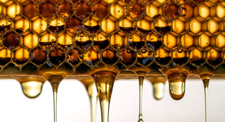 Honey dripping from a hexagonal honeycombs filled with sweet honey