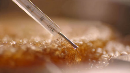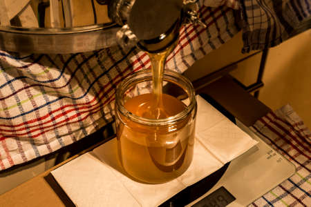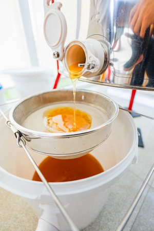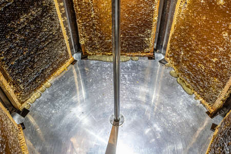 Photo of pumping honey from bee honeycombs in a honey extractor