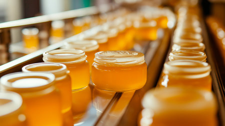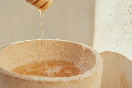 AI Generated. Honey Dripping from Wooden Dipper into Glass Jar Outdoors