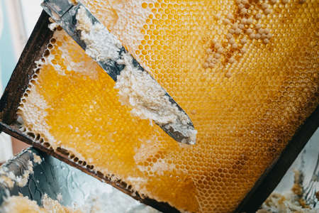 Knife cuts off sealed honeycomb and sweet honey flows out of it. Production of nectar in apiary. Manual labor, insect care. Beekeeping culture concept, yellow harvest. High quality photo