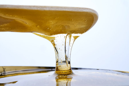 Thick syrup drips down in a sweet, sticky cascade highlighting a rich golden hue
