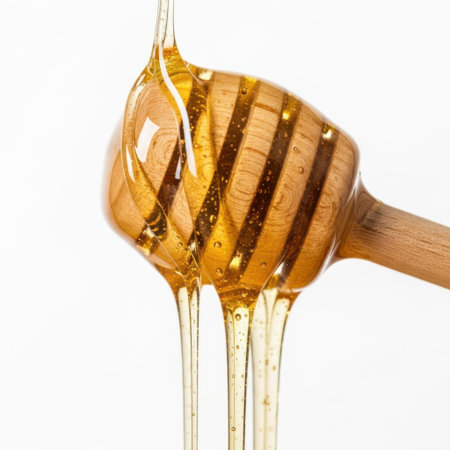 Close up image of honey dripping from a dipper, highlighting its rich texture and golden hue