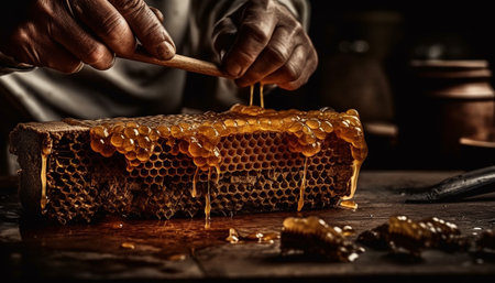 Close-up of a honeycomb with honey dripping slowly, showcasing the rich golden color and intricate texture. highlights the natural sweetness and organic purity, suitable for culinary and health-related projects. Generative AI