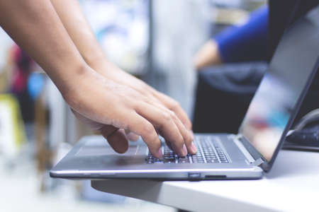 Selective focus Business man using laptop computer. Male hand typing on laptop keyboard . Administrator working in data center configure and check internet network on computer laptop