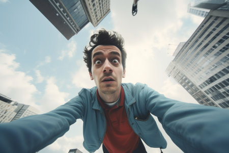 young man with a surprised expression looks down towards the camera, surrounded by tall urban buildings, capturing a unique perspective and city vibe