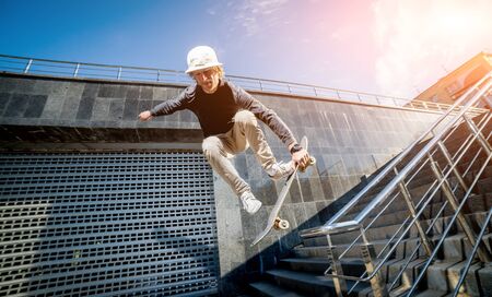 Skatboarder practicing and jumping on the streets.