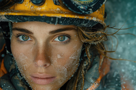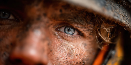 Intense close-up portrait of a firefighter's face, covered in sweat and soot, expressing courage and determination.