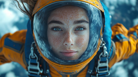Close-up portrait of a beautiful girl in space suit and helmet.