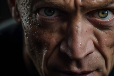 Close-up portrait of a man with drops of sweat on his face. Sport and training concept, generative AI illustration.