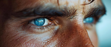 Intense macro shot of a person's eyes with detailed textures. Hyper-realistic close-up. Human emotion and vision concept. Design for health brochures, scientific presentations. Macro shot with high detail focus.