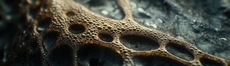 A close up of a rock with a lot of cracks and holes. The rock appears to be old and worn down, with a sense of decay and abandonment. The cracks and holes give the rock a rough and rugged appearance