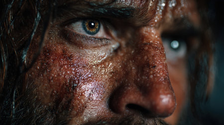 Intense close-up of a rugged man with long hair and beard, showcasing weathered skin and deep expression, conveying themes of resilience and survival in a dramatic setting