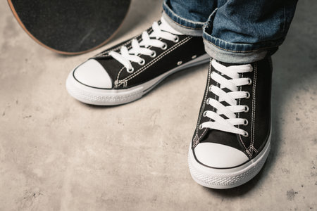 Skateboard stunt training. Skateboard and children's feet in sneakers against wall background. Healthy lifestyle concept. Shallow depth of field. Selective focus.