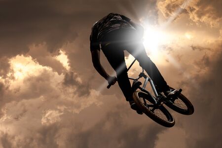 Silhouette of a cyclist flying in background the sun and blue sky with clouds