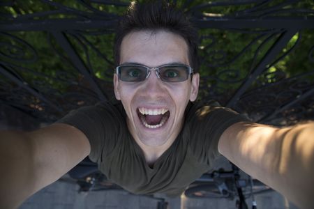 Smiling young man in green shirt with sunglasses with bike bellow. on green background of bushes and black metal fence stands with raised hands out of the frame.