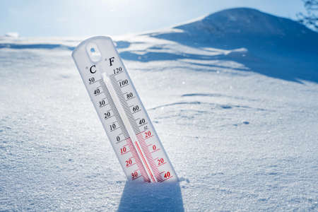 Celsius and Fahrenheit thermometer on the surface of white pure snow. Copy space