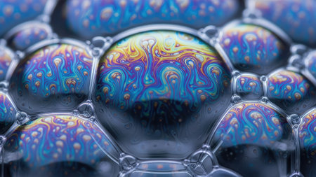 Vibrant rainbow bubbles reflecting light on a dark backdrop with prismatic effects