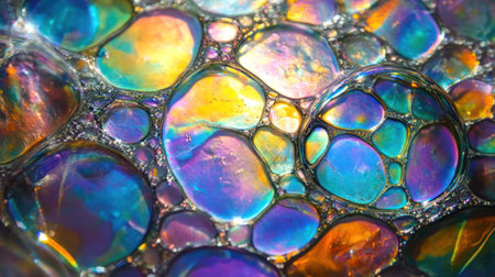 The image is a close up of a colorful, bubbly surface with many small bubbles. The bubbles are of various sizes and colors, creating a vibrant and lively atmosphere. Scene is energetic and playful