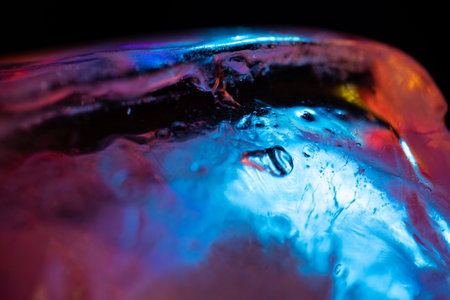 Close-up of colorful ice with water droplets, illuminated by vibrant lights