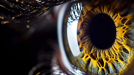 Extreme close up view of a womans eye with a vibrant yellow and orange iris, showing intricate detail