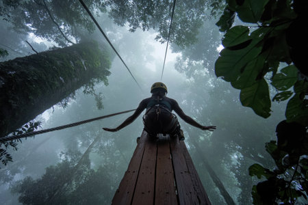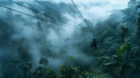 An adventurer ziplining through a misty tropical forest, capturing the excitement and thrill of outdoor activities