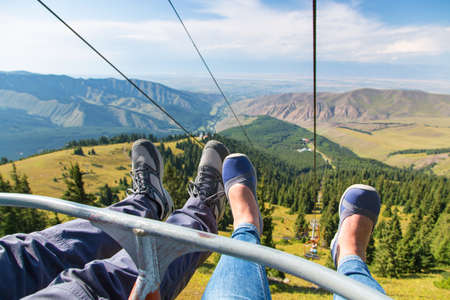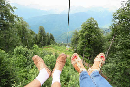 Feet of people over the abyss. Mountain summer landscape. View from the ski lift at the ski base