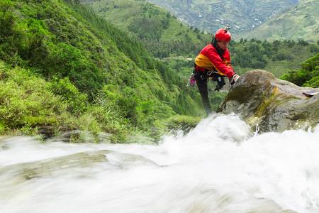 canyoning istructor opening a new route in chamana waterfall, banos de agua santa, ecuador. one of the most popular touristic destination in the country.